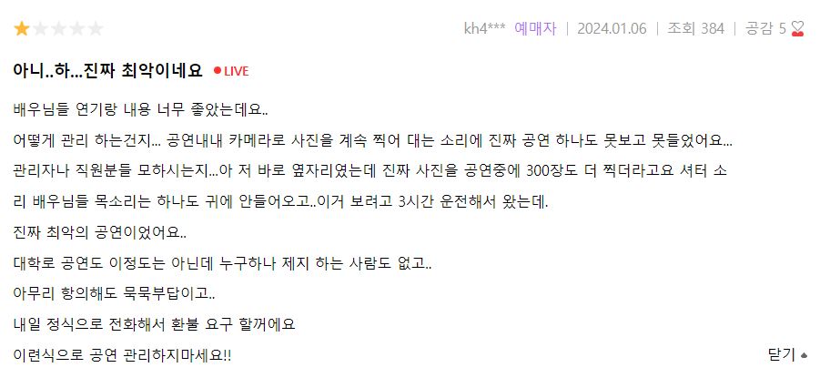 열심히 노력하고 준비한 배우들을 위해서라도 연극에 집중하지 못하는 하는 행동들을 조심해야할 것 같네요 ~