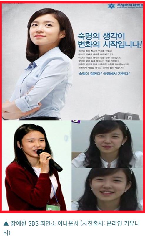 장예원씨는 숙명여대 3학년 재학시절 아나운서시험에 합격하는 큰 일을 해 냈는데요 숙명여대에는 "명언재"라고 하여 교내에서 언론고시를 준비하는 반이 별도로 있었다고 하네요 숙명여대 출신 아나운서로는 윤현진씨,정미선씨 등이 있습니다