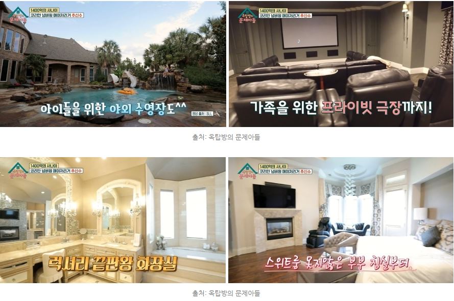 추신수 씨는 이 집을 구매하기 전에 1200평 대 저택을 텍사스에서 구매한 적이 있었는데 이곳도 체력단련실이나 야외 수영장 그리고 프라이빗 극장까지 모두 갖추고 있었는데 미국에서 산불이 크게 나면서 집이 전소되는 아픔을 겪고 다시 매수한 집이 지금 5500평 집이라 역시 집은 지금 살고 있는 곳보다 큰 데로 가게 되어 있나 봅니다 이때는 화장실이 8개 지금은 14개 두배로 상승이네요 ^^