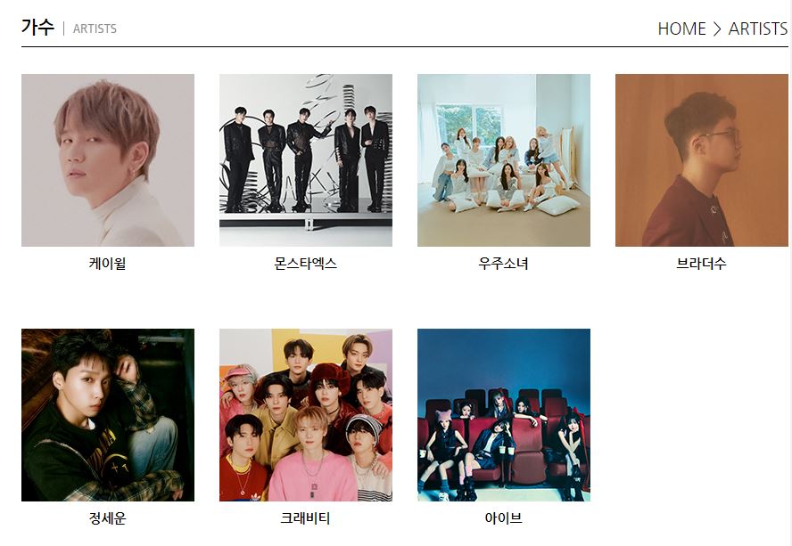 이 소속사에 소속되어져 있는 가수로는 케이윌,우주소녀,몬스타엑스,정세운,아이브,크래비티,브라더수가 있습니다.