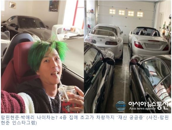 팝핀현준 씨는 4층짜리 건물에 2층에는 박애리 씨의 연습실이 3층에는 침실과 팝핀현준의 벽화그림 그리고 주차장에는 페라리, 머스탱, 포르셰 등이 진열되어 있고요 자동차만 5대 오토바이는 2대가 있다고 하네요 부럽다
